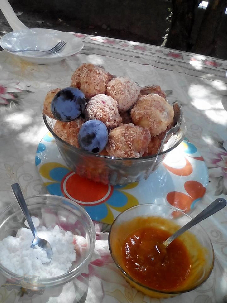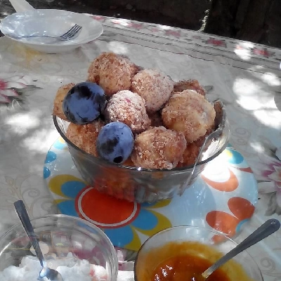 Ha a víz forrni kezd, picit sózzuk meg, és kb. ping-pong labda méretű golyókat gyúrjunk belőle. A golyókat kissé lapítsuk ki, a mélyedésbe tegyük az édesített szilvákat, és a tésztát (újra) formáljuk gombóccá.