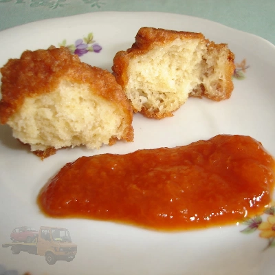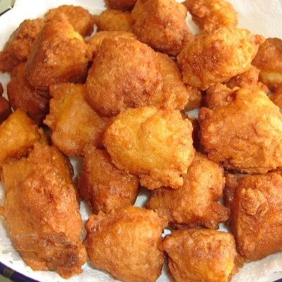 Az alapanyagokat jól elkeverjük egymással. Ha több időnk van, a fehérjét felverhetjük habbá, és úgy is hozzáadhatjuk, de ez nem fontos, itt is egész tojások kerültek bele. A bő zsiradékot felmelegítjük, és kiskanállal diónyi darabokat szaggatunk bele.