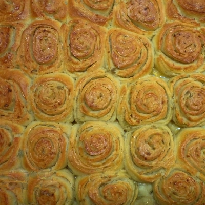 A tészta nagyobbik felét is kinyújtom ,megkenem a töltelékkel,